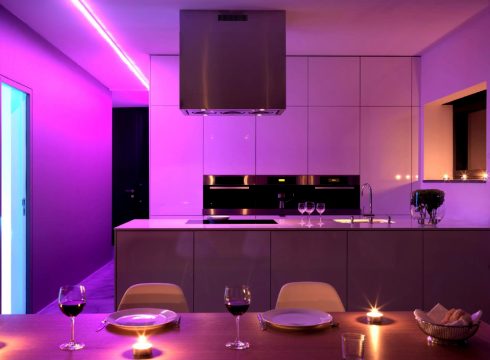 Кухонные шкафчики белого пластика окантованные алюминием обретали самые разные оттенки. Летом пеструю ленту почти не включали, зато длинные зимние вечера она могла превратить в буйство тропических красок.
